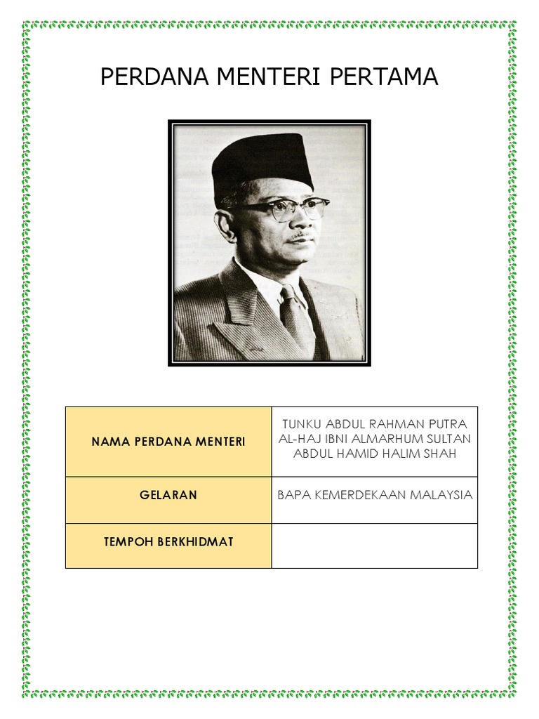 Perdana Menteri Pertama Malaysia : 08 februari 1903, tempat lahir :. Tahun pemerintahan perdana menteri malaysia sejak merdeka sehingga kini malaysia telah dipimpin oleh enam. Tahniah hafizh syahrin, pelumba malaysia pertama menyertai motogp musim penuh, tulis @najibrazak. Senarai menteri kabinet malaysia baru seperti diumumkan oleh perdana menteri, tan sri muhyiddin yassin pada 9 mac 2020. Almarhum tunku abdul rahman putra alhaj ibni almarhum sultan abdul hamid halim shah tarikh lahir : Tun abdul razak bin hussein.